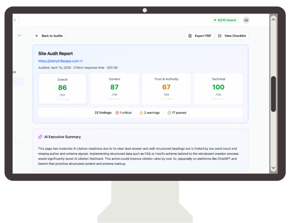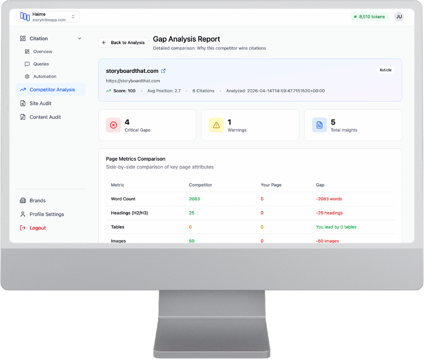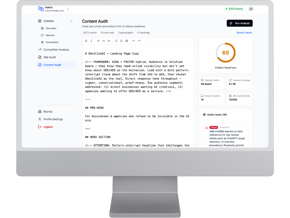 That's what OmniCiteAI does. One dashboard shows you everything: which AI platforms are already citing you, which ones are citing your competitors instead, what's broken on your site that's blocking AI crawlers, and what to fix first.